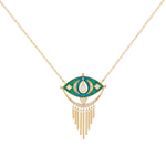 CELINE DAOUST 14K LIGHT YELLOW GOLD CHAIN NECKLACE WITH A GREEN ENAMEL PENDANT WITH ONE PEAR DIAMOND EYE, COMPLETED WITH SQUARE DIAMONDS AND DANGLING DETAILS. EACH PENDANT IS COLORED BY HAND.