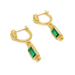 The Emerald Baguette Drop Earrings feature two bright green, Emerald stones. Every detail was casted and crafted in Los Angeles.
