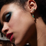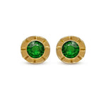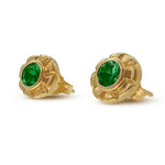 The Emerald Flower Studs feature bright green, Emerald stones encased in a golden flower.