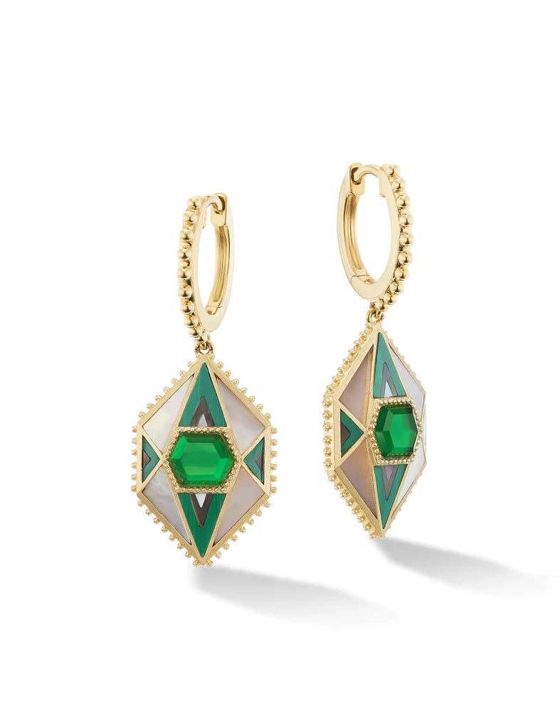 MARRAKESH HUGGIE EARRINGS IN MALACHITE, GREY MOP, & GEEN QUARTZ