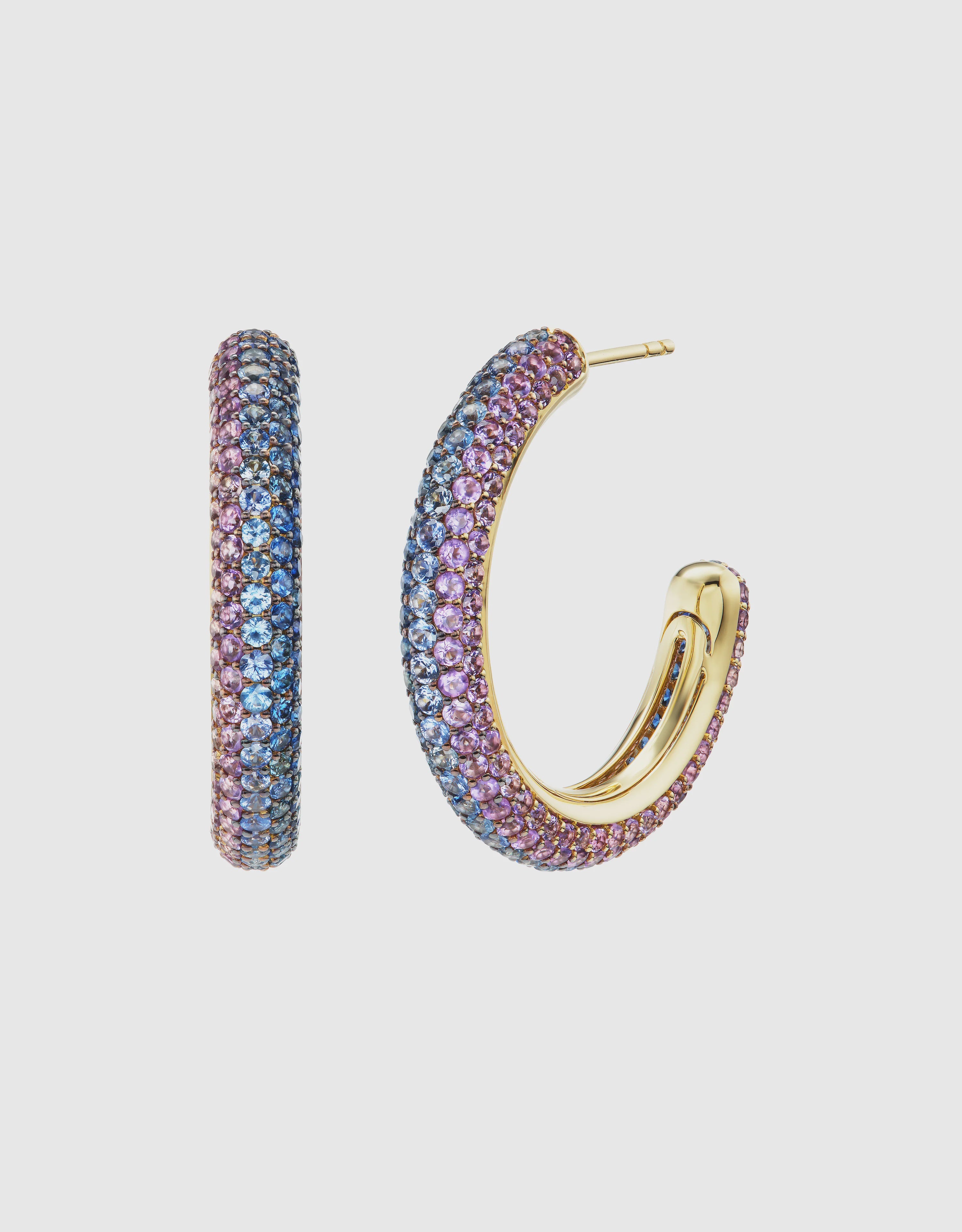 The Midnight Puffy Hoop display an ombre or purple and blue sapphires and amethysts. Swap ears for a totally different look.