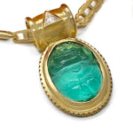 The Scarab of this pendant is made of Green Venetian Glass and it’s accented with a trillion-cut Diamond. Every detail of the pendant and intricate chain was casted and crafted in Los Angeles.