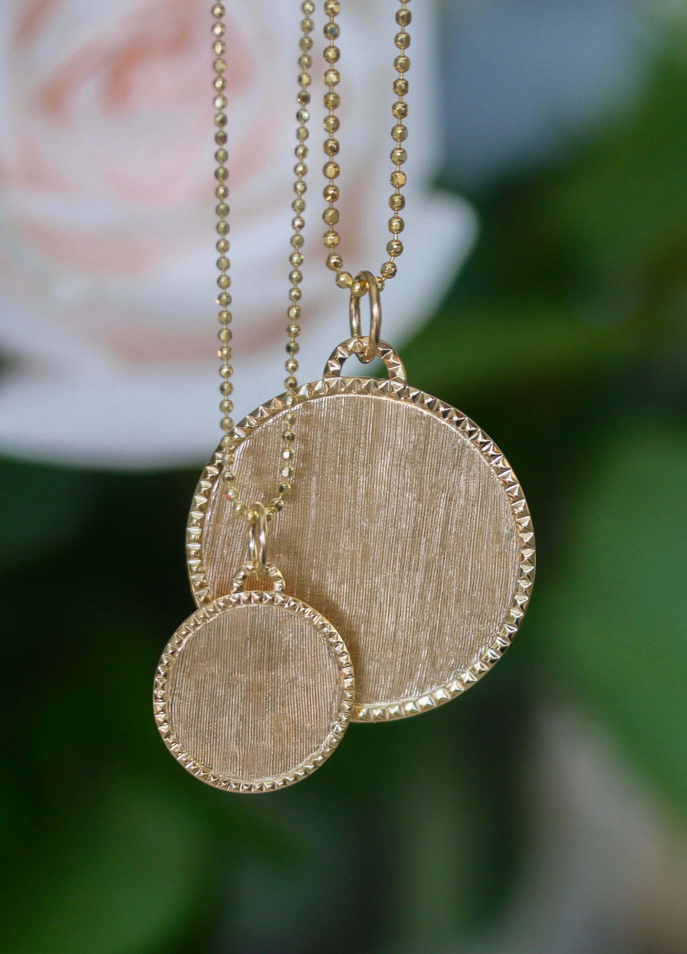 Add a touch of elegance to your style with our Classic Gold Stud Disc Pendant! Crafted from 18k Florentine gold, this pendant features a beautifully studded edge that gives it a unique and luxurious statement. Perfect for any occasion, it makes for a perfect necklace to elevate your jewelry wardrobe and make you feel confident and stylish.