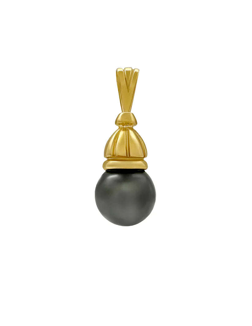 The Elise Pendant with Tahitian Pearl is an elegant pendant that features a lustrous black pearl, suspended in a beautifully crafted golden cradle, adding a touch of sophistication and highlights the natural beauty of the pearl.