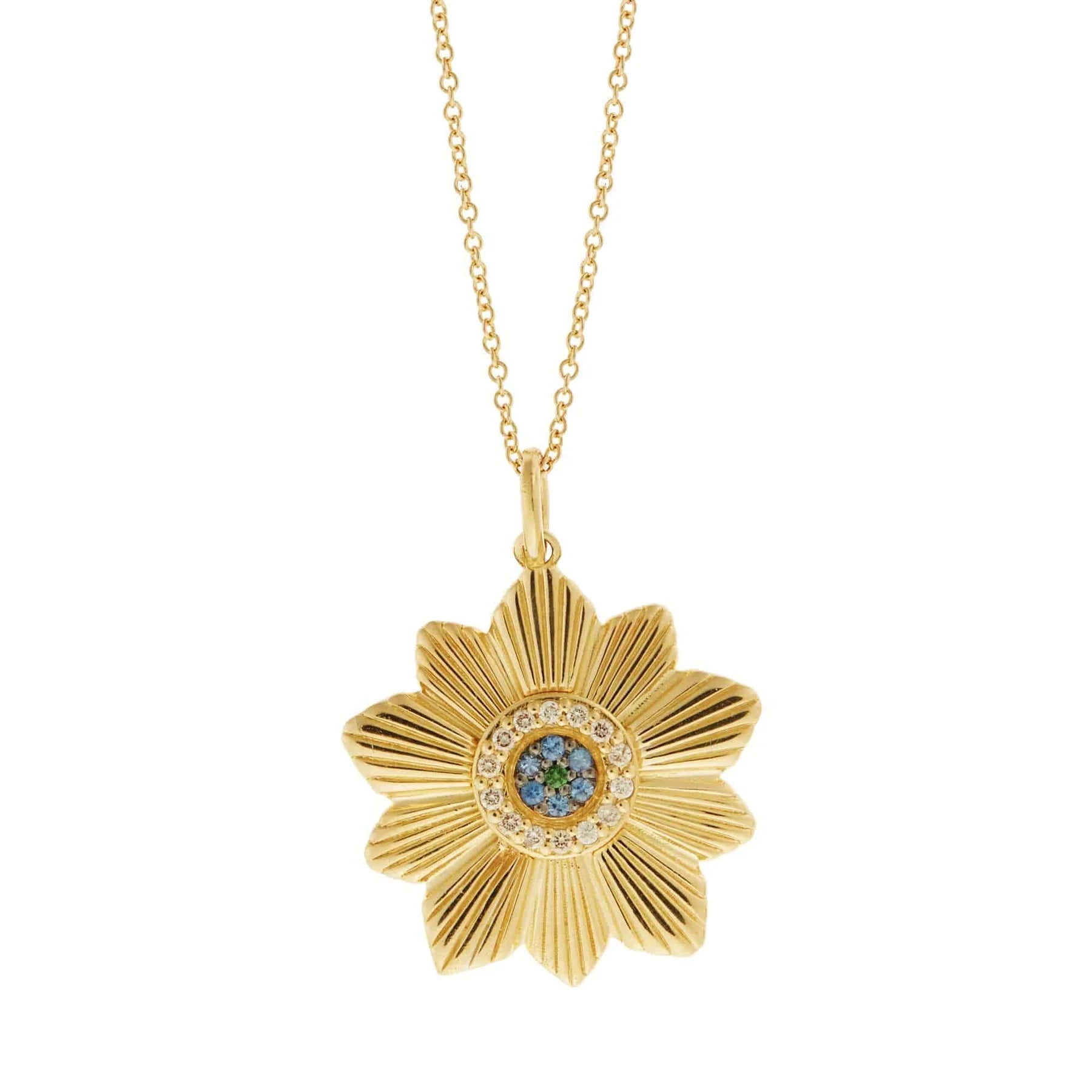 Handcrafted of 18k yellow gold and satin-finished, this pleated flower eye pendant sparkles with pavé champagne diamonds, blue sapphires and a tsavorite "pupil" center oxidized on the stones.
