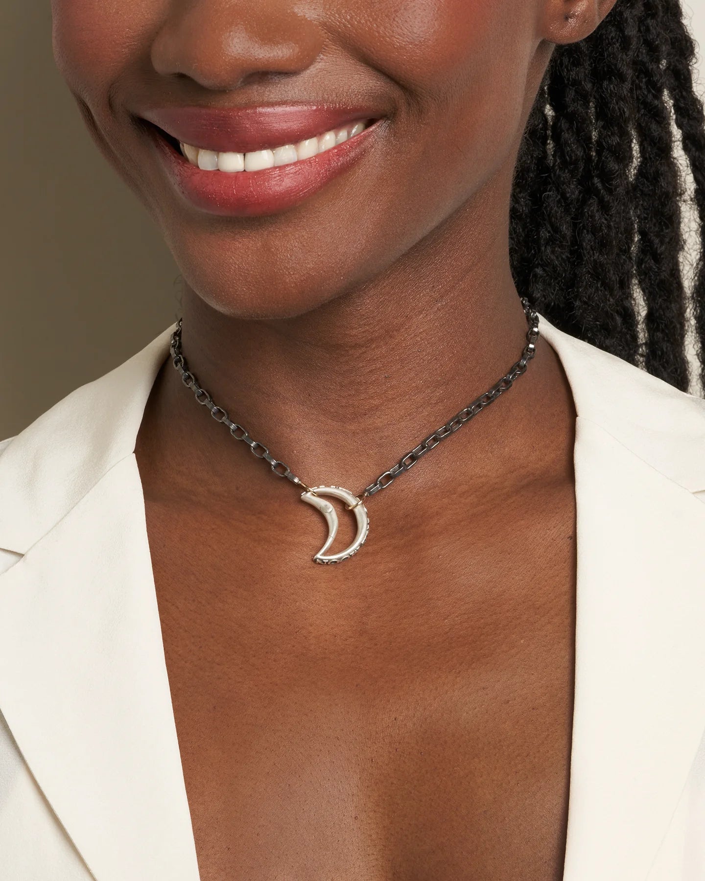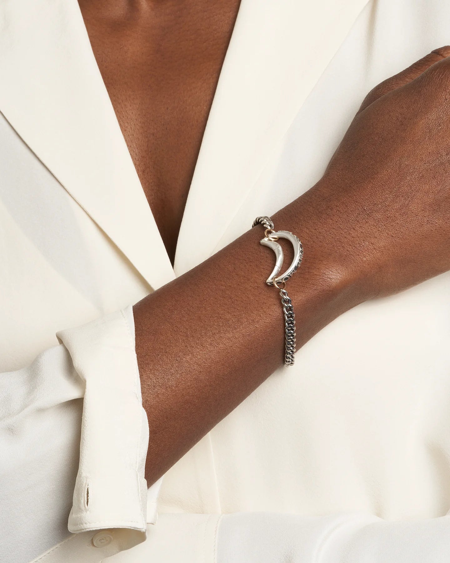 A joyful and romantic version of our newest Moonlocks featuring the iconic phrase, “Fly me to the Moon” in a deep emboss on the “lunar limb” of the Lock. This new version of our Moonlock in sterling silver has an elegant and highly functional lever mechanism that opens and closes. It’s different than the old Moonlock. It is weighty in the way you would expect from our jewelry. And they are of course good at “braceleting”, “necklacing”, “charm-holding”, and everything else you will dream up as you play with them.
