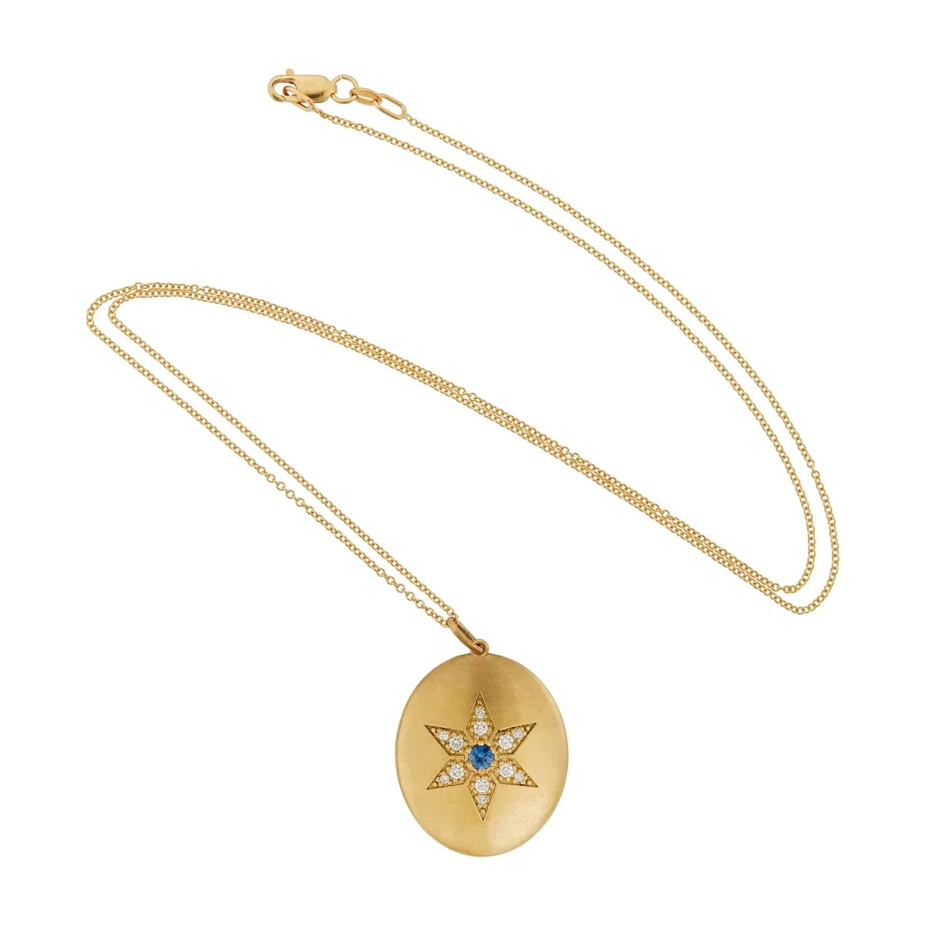 This elegant Six Point Star Pendant is lovingly handcrafted from 18K satin-finished Yellow Gold. Adorned with white diamonds and a breathtaking blue sapphire in the center, this pendant reflects the age-old symbol of alchemists for the union of opposites and the concept of “as above, so below”.