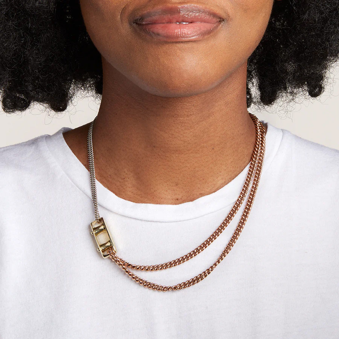 Have you ever thought your chain needed to get dressed? We felt it did (of course), which is why we made The Stoned Tandem Pulley, another jewelry tool/object/charm that we think you'll find endless ways to incorporate into your collection. With its double vertical wheels, you can carefully weave your chain through it...you can connect chains together simply, or in ways we've not thought about yet…it can also hang on its own.