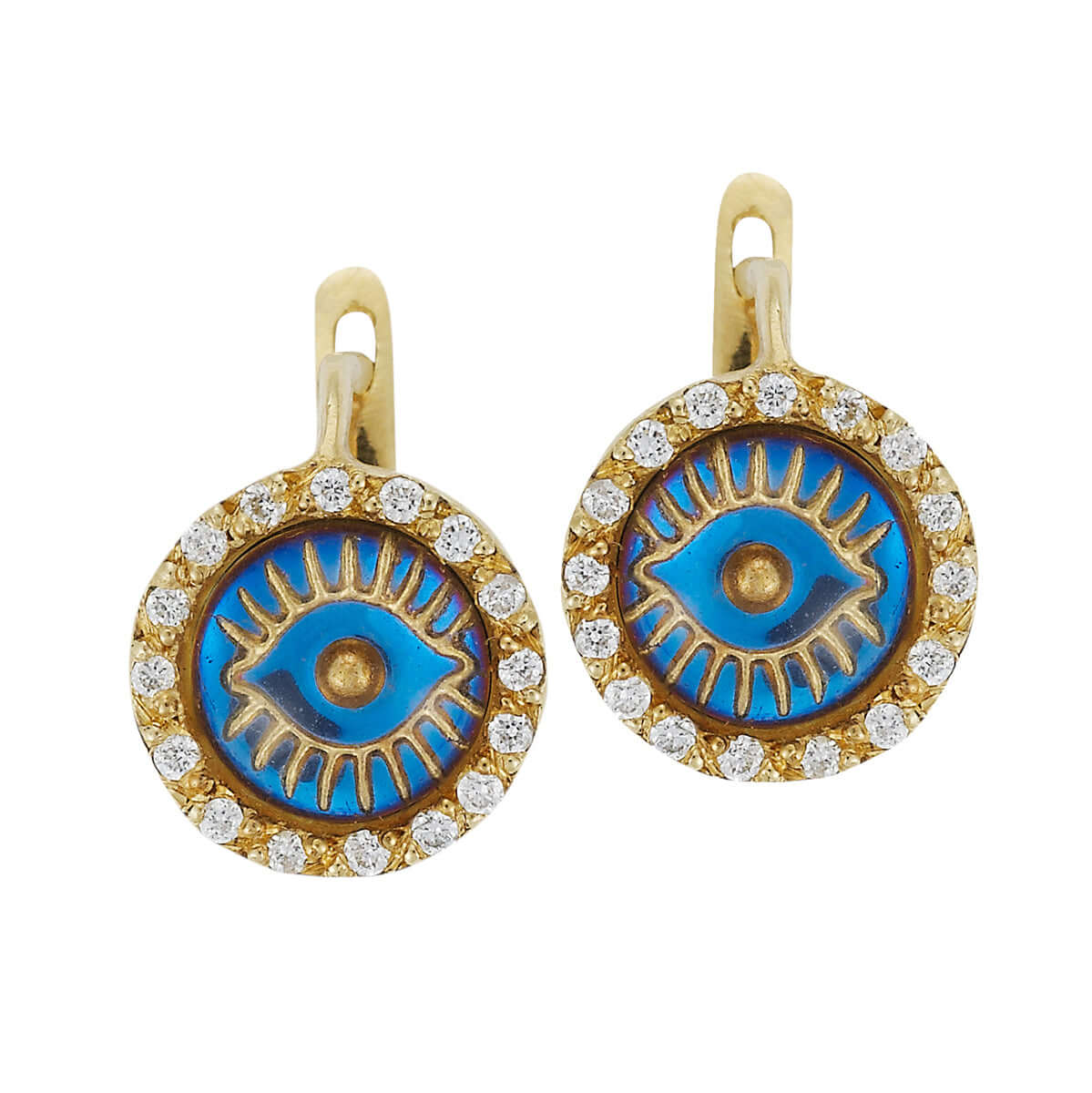 Our 18k Gold Iredescent Eye earrings feature a central iredescent glass eye cabochon, surrounded by a sparkling halo of White Diamonds all around. Perfect for every day.