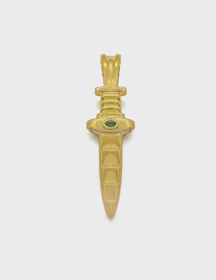 The Dagger Pendant is a bold statement piece featuring a hand-carved dagger embellished with a Paraiba stone. Seen as strong symbols of protection, loyalty and sacrifice, the dagger motif is infused with spiritual significance. Every detail of this gorgeous necklace was casted and crafted in Los Angeles.