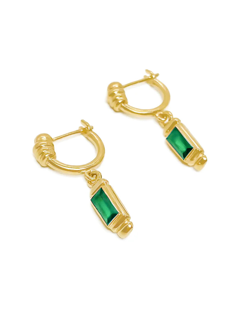 The Emerald Baguette Drop Earrings feature two bright green, Emerald stones. Every detail was casted and crafted in Los Angeles.