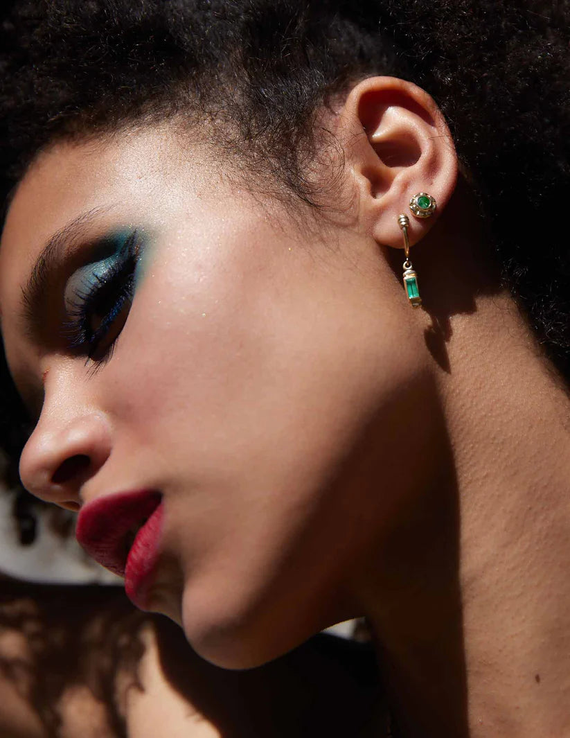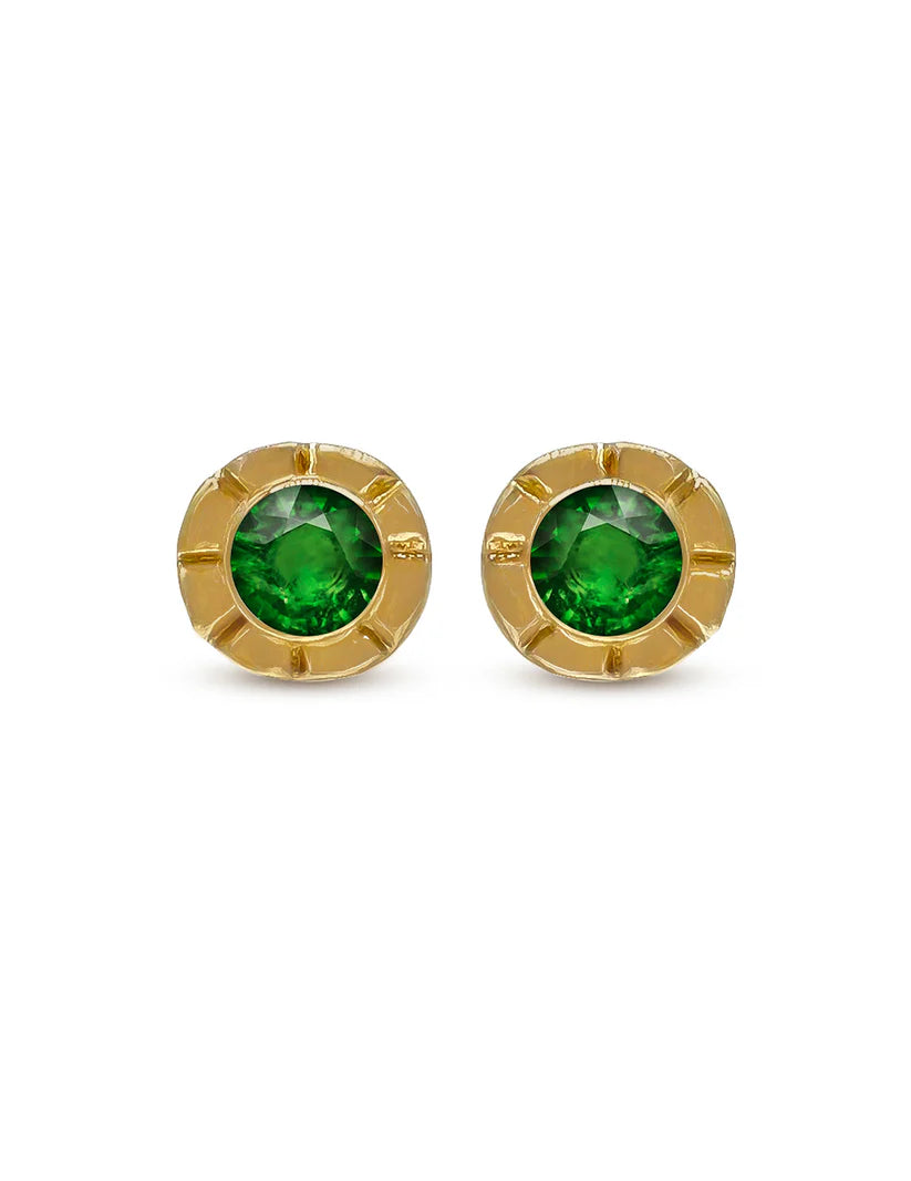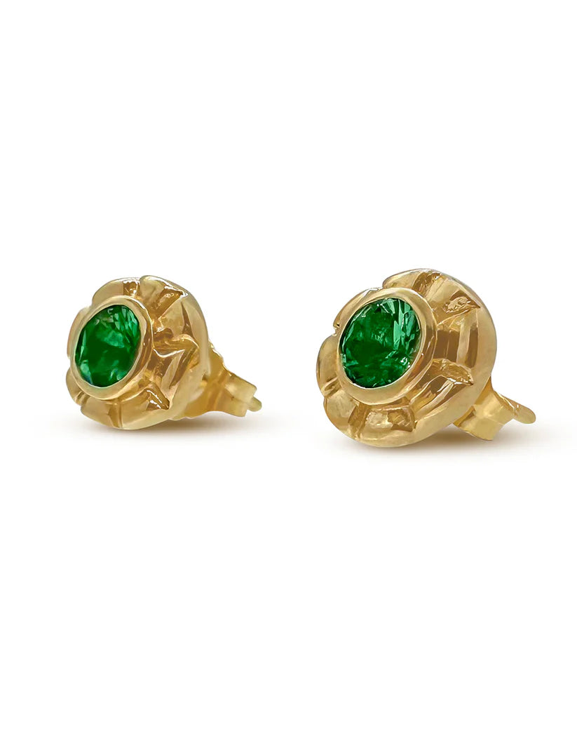 The Emerald Flower Studs feature bright green, Emerald stones encased in a golden flower.