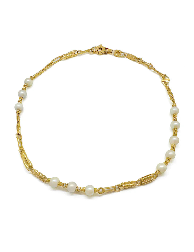 The Metropolis Necklace with Pearls features a variety of uniquely crafted links and saltwater pearls. Every geometric detail was created in Los Angeles. With a mix of geometric shapes forming each link, this bracelet has an architectural feel that’s the perfect mix of modern and classic.