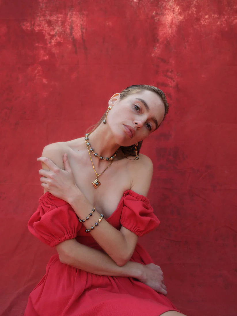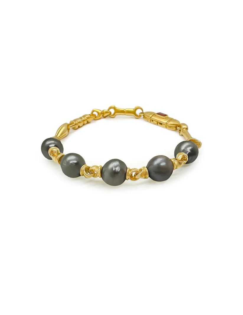 The Rami Tahitian Pearl Bracelet is the perfect balance of dainty pearl and sturdy chain. Each link was casted and crafted in Los Angeles. The feature of this bracelet is a series of five tahitian pearls along the side. The bracelet clasps together with a Ruby promoting love, nurturing, and knowledge.