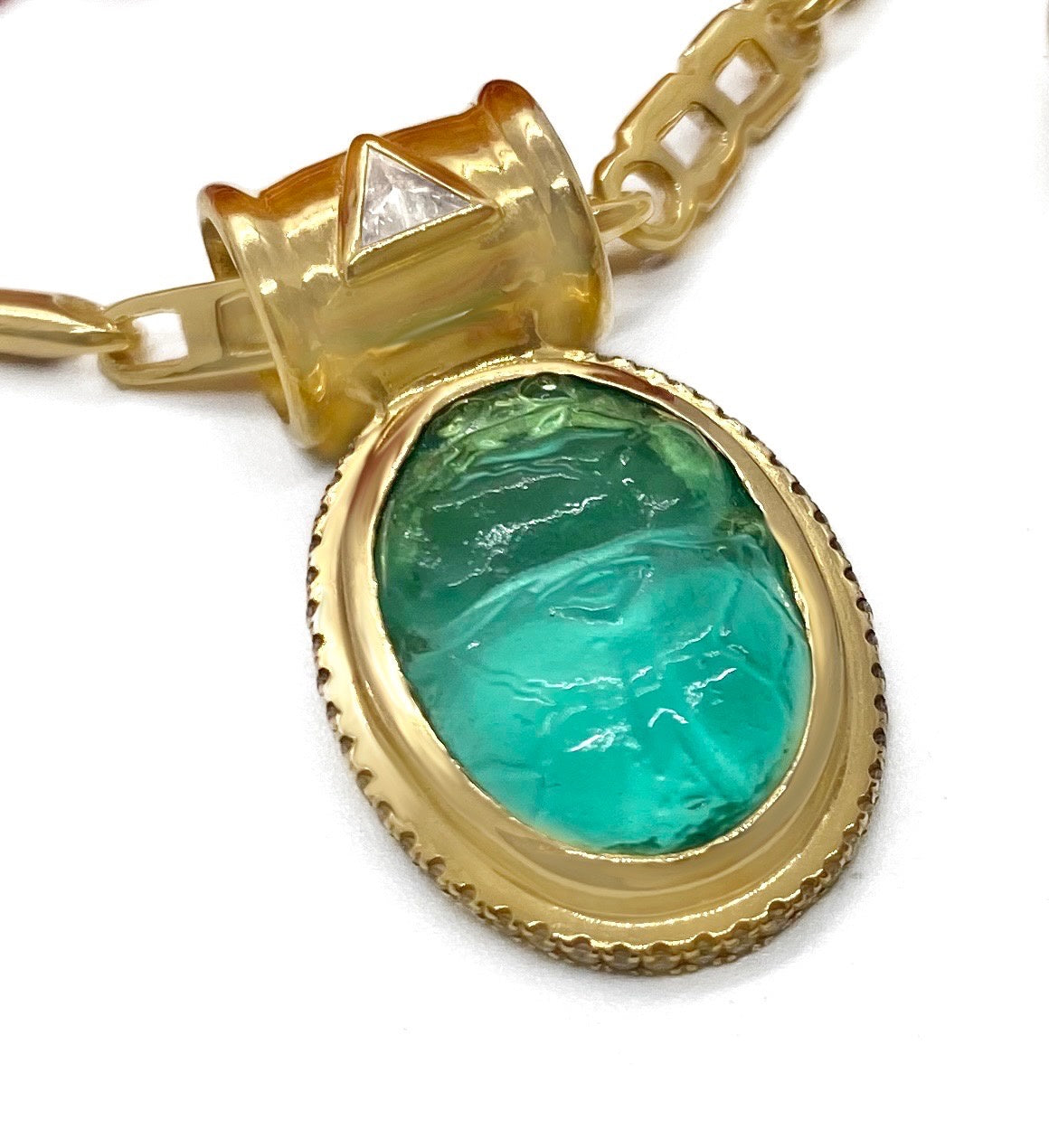 The Scarab of this pendant is made of Green Venetian Glass and it’s accented with a trillion-cut Diamond. Every detail of the pendant and intricate chain was casted and crafted in Los Angeles.