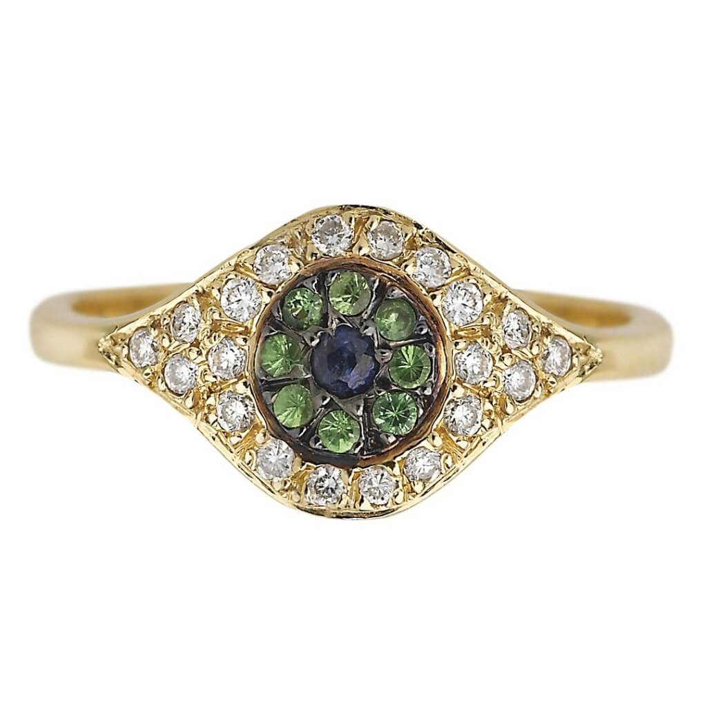 A signature Ileana Makri piece - this 'Cats Eye' ring is handcrafted from 18-karat yellow gold and set with white diamonds, tsavorites and blue sapphire centre.