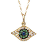 Kitten Eye pendant. Crafted of luxurious 18k yellow gold and embellished with sparkling pavé white diamonds, tsavorites and a dazzling blue sapphire diamond center, this timeless design exudes glamour and sophistication. With this pendant, you'll always make an unforgettable statement.