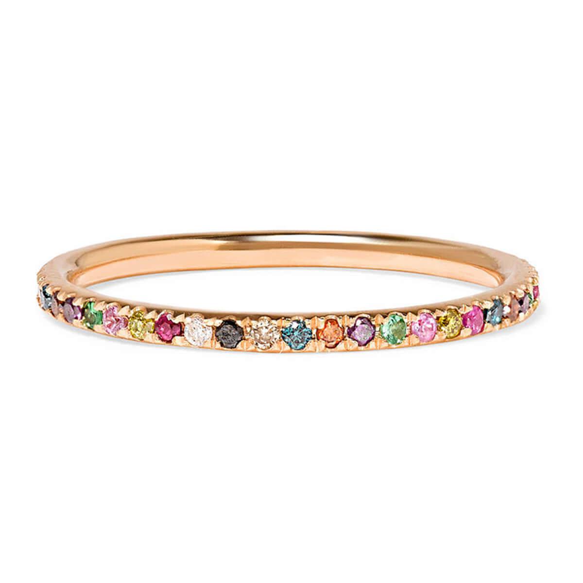 Our luxurious Rainbow Thread Band ring captures the spectrum of life's wondrous colors with its mesmerizing row of vibrant precious stones featuring 0.329-carats of purple, orange, blue, brown, yellow and white diamonds, rubies, pink sapphires and tsavorites. Handcrafted from 18-karat rose gold, this elegant band is an ideal piece to commemorate wedding anniversaries and special proposals, shimmering with beauty and splendor.
