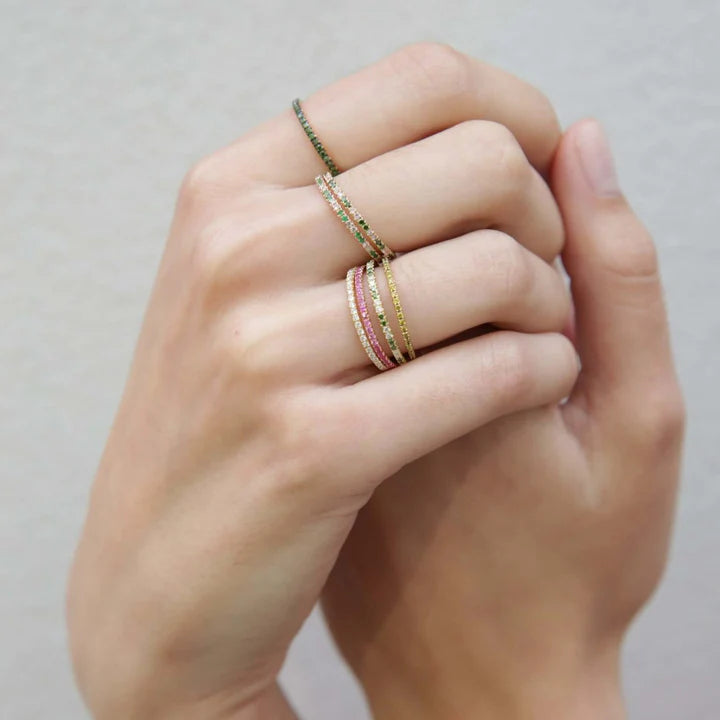 Add a timeless touch to your jewelry collection with Ileana's Thread Stripes band. Crafted from luxurious 18-karat yellow gold, this exquisite accessory sparkles with alternating rows of vibrant green and white diamonds, evoking a classic yet modern look. Symbolizing everlasting love, this glittering piece is the perfect way to commemorate a special occasion.