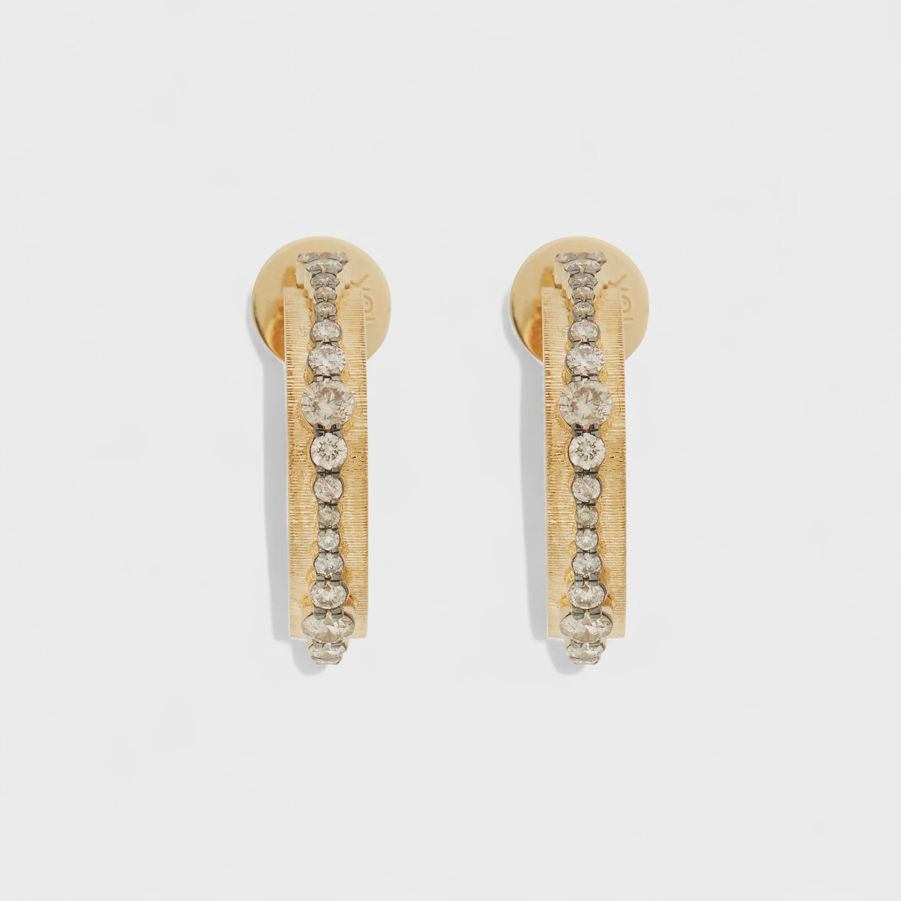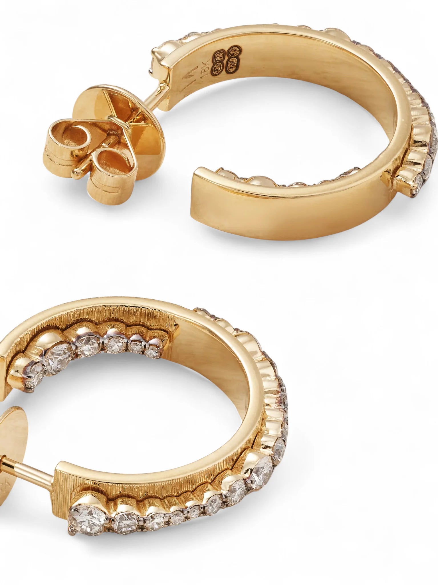 These luxurious 18k yellow gold hoop earrings are adorned with 1.1 carats of light brown diamonds, plated with black rhodium for a striking contrast. The meticulously crafted design highlights the natural brilliance of the diamonds, offering a modern yet timeless aesthetic. With a total weight of 8.3 grams, these earrings are lightweight yet durable, making them perfect for both everyday elegance and special occasions. Elevate your style with these sophisticated statement hoops.
